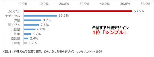 もし戸建て住宅を建てるなら、どのような外観のデザインが良いか尋ねたところ、「シンプル」(53.5%)が1位となりました。(図11)