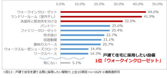 採用したい間取りは、「ウォークインクローゼット」(44.0%)が最多。「ランドリールーム(室内干し)」(41.9%)、「洗面所と脱衣所を分ける」(32.0%)と続きました。(図13)