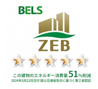 本物件においては、Low-Eガラスの採用や高断熱化に加え、冷暖房効率の高い空調を採用するなど、様々な環境配慮技術を採用することで、基準一次エネルギー消費量から約51%の削減を達成し、BELS(建築物省エネルギー性能表示制度)認定の最高評価(五つ星)を獲得するとともに、「ZEB Ready」認証を2024年3月22日付で取得いたしました(南海電鉄グループ初)。