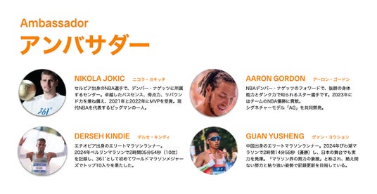 『361°』は、オリンピックやワールドマラソンメジャーズ各大会との関わりを持つグローバルブランドであり、NBA MVPニコラ・ヨキッチ選手をはじめとする世界的アスリートをアンバサダーに擁しています。