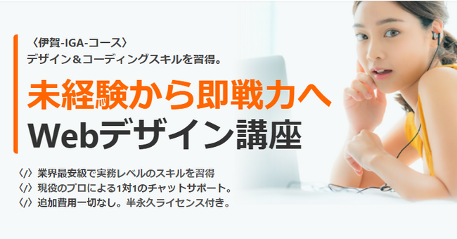 また、プロのWebデザイナーによるサポートも充実しており、「伊賀-IGA-」を受講すると24時間365日のチャットサポートを無料オプションで利用する事ができるため、未経験からWebデザインを学ぶことができるサービスとなっております。