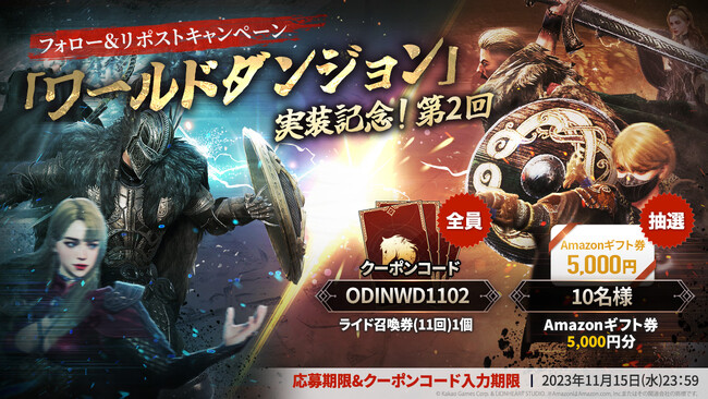 先週アップデートされた「ワールドダンジョン」実装を記念したフォロー&リポストキャンペーンの第2回を11月2日(木)定期メンテナンス後より開催します!『オーディン:ヴァルハラ・ライジング』公式X(旧Twitter)をフォローした状態で、同日に投稿されるキャンペーンポストをリポストされた方の中から、抽選で10名様にAmazonギフト券5,000円分をプレゼント!