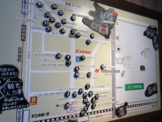 株式会社日本ユニスト(大阪市、代表取締役・今村亙忠)が運営する「Willows Hotel 大阪新今宮」(大阪市浪速区)は4月18日より、周辺店舗や施設をホテルスタッフが手書きのコメントとともに紹介する案内板をホテルロビーに設置します。マップにはスタッフだけでなく、お客様自身も書き込めるようにすることで、網羅的に情報を共有できるようにします。