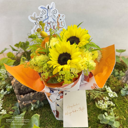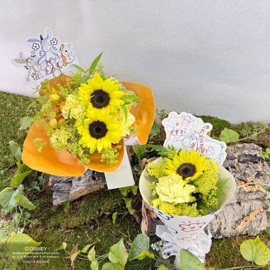 今回は、夏の人気フラワー・ひまわりを中心にはちみつイエローの花々を束ねた全2種類のフラワーアイテムをご用意しています。ラッピングにはプーさんと仲間たちが描かれたオリジナルデザインのペーパーを使用。