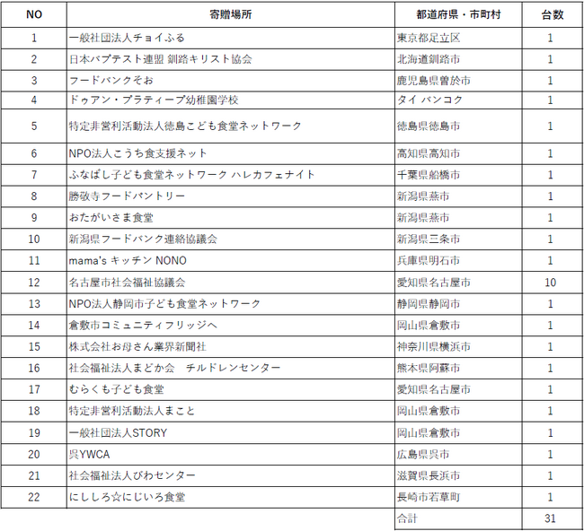 2022年度下半期(10月~23年3月)は、愛知県を始めとする全国22カ所のフードバンク・子ども食堂・コミュニティフリッジなどに32台の業務用冷蔵庫を寄贈しました。今後も冷蔵庫の寄贈や、ボランティア活動を通じて、社会貢献活動に積極的に取り組んでまいります。