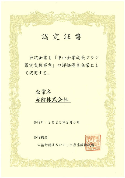 消防設備・建築物点検等を行う赤防株式会社(本社:広島県、代表者:谷口 守)は、公益財団法人ひろしま産業振興機構が運営する中小企業成長プラン策定支援事業において、「評価優良企業」に認定されたことをお知らせします。企業価値向上に向けた本業支援の一貫として、お申込みいただきました。