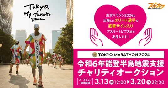 株式会社モバオク(本社:東京都渋谷区、代表取締役社長:生田目 知之、以下モバオク)がエンゲート株式会社(本社:東京都中央区、代表取締役:城戸 幸一郎、以下エンゲート)と業務提携し提供するスポーツチーム公式オークションサービス「スポオク」は、一般財団法人東京マラソン財団が実施する「東京マラソン2024 令和6年能登半島地震支援 チャリティオークション」を2024年3月13日(水)から開催します。