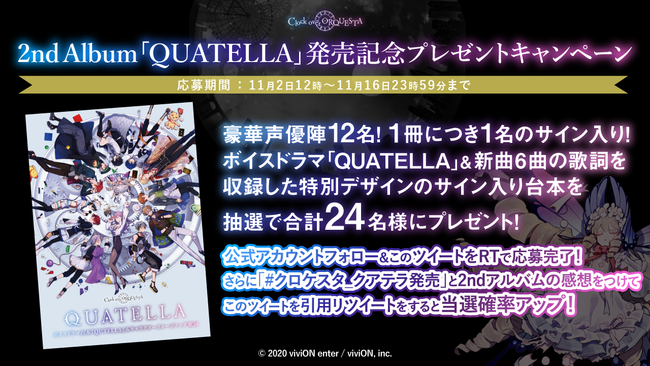 2ndアルバム「QUATELLA」の発売を記念し、少年役を担当する豪華声優陣12名・1冊につき1名のサインが入ったサイン入り台本を抽選で24名様にプレゼント!