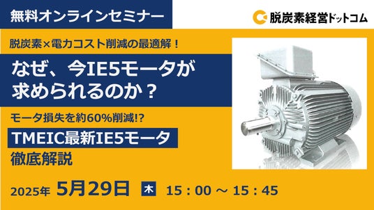 「RE100」の中小企業版「RE Action」に加盟し、脱炭素経営を推進する電巧社(本社:東京都港区、代表取締役社長:中嶋 乃武也)では、弊社が運営する「脱炭素経営ドットコム」にて、無料オンラインセミナー「脱炭素×電力コスト削減の最適解!なぜ、今IE5モータが求められるのか?~モータ損失を約60%削減!? TMEIC最新IE5モータ徹底解説~」を、2025年5月29日(木)15時から開催いたします。