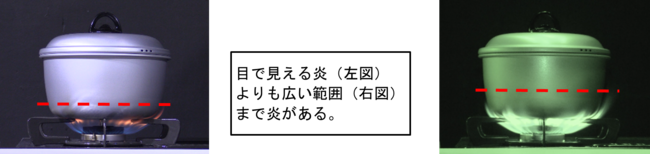 ガスこんろで加熱中の鍋を赤外線カメラで見た様子(右が赤外線カメラの画像。緑の部分が炎)