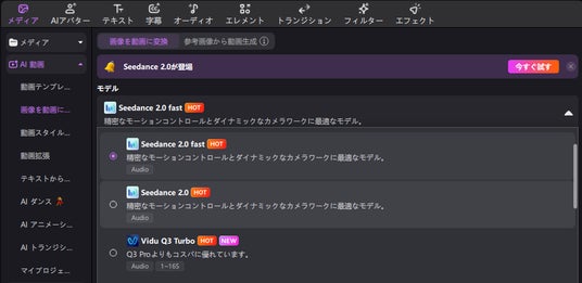 また、HitPaw Edimakorでは「Seedance 2.0」と「Seedance 2.0 Fast」の2種類のモデルを利用可能です。用途に応じて使い分けることで、より快適に動画生成を行えます。