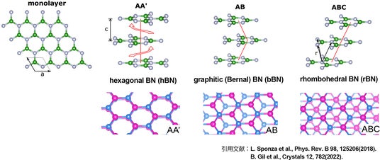 ※図の説明:単一層 BN(mBN)がAA'AA'・・・の順に積層した場合がhBNであり、ABのグラファイト型積層がbBN、ABC 菱面体積層がrBNです。