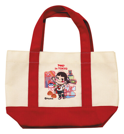 スマイルスイッチ部のユニフォームを着たペコちゃんと、東京の名所や名物がワンポイントで入った、東京限定のトートバッグです。