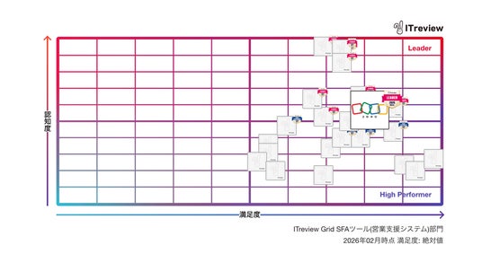 「ITreview Grid Award」は、法人向けIT製品・クラウドサービスのレビュープラットフォーム「ITreview」に投稿されたユーザーレビューをもとに、四半期ごとに発表されるアワードです。顧客満足度と市場認知度を軸に製品を分類し、「Leader」「High Performer」などの称号が授与されます。最高位となる「Leader」は、顧客満足度および市場認知度の双方で高い評価を獲得した製品に授与されます。