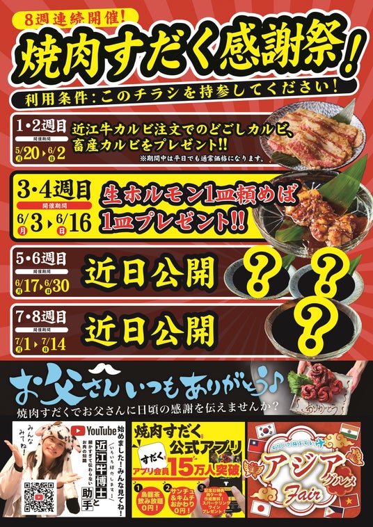 株式会社総合近江牛商社(本社:滋賀県守山市/代表取締役社長:西野 立寛)が運営する【近江焼肉ホルモンすだく】は、2024年5月20日(月)~7月14日(日)の8週にわたり、下記の対象店舗にて「焼肉すだく感謝祭」を開催いたします。