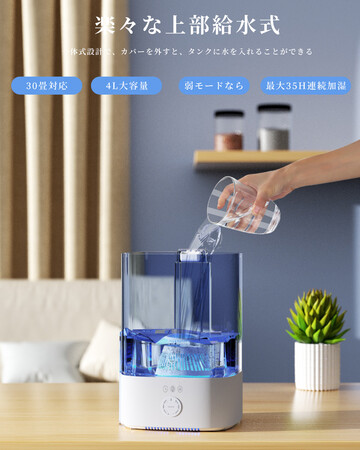 【3.5L大容量、操作簡単・最大18畳対応】上部給水式のため、持ちやすい容器で上から注いで給水もラクラク、タンクからの滴りもありません。操作が非常に簡単します。また、3.5L大容量で、水タンクを満タンにすれば、約11~35時間の連続使用が可能で、頻繁に給水する必要がなく、長時間加湿したい場合にもピッタリです。超音波式による優れた加湿能力を備えており、強モードの約250ml/hの加湿能力や360°自由回転の吹出口によって、最大18畳でより広い範囲にうるおいをお届けできて、効率よく湿度を保ちます。