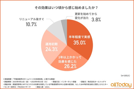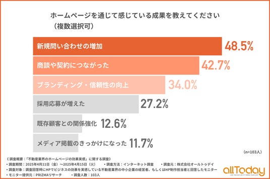 株式会社オールトゥデイ(本社所在地:埼玉県さいたま市)は、HPでビジネスの効果を実感している不動産業界の中小企業の経営者、もしくはHP制作担当者を対象に、「不動産業界のホームページの効果実感」に関する調査を実施しましたので、その結果を公表します。