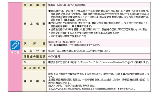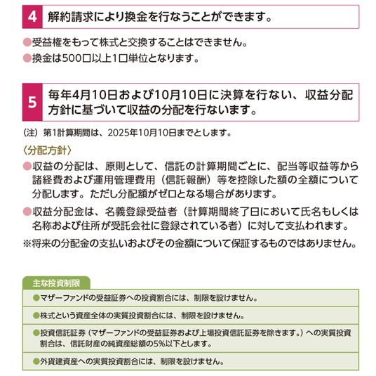 - 株式または金銭の拠出により当ファンドの取得(応募、追加設定)をご希望の場合には投資信託説明書(交付目論見書)を販売会社(指定参加者)よりお渡しいたしますので、必ず内容をご確認ください。