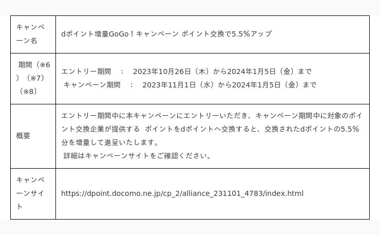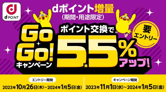 株式会社NTTドコモ(以下、ドコモ)は、対象のポイント交換企業(※1)が提供するポイントをdポイントへ交換すると5.5%増量になる「dポイント増量GoGo!キャンペーン ポイント交換で5.5%アップ」(以下、本キャンペーン)を、2023年11月1日(水)から2024年1月5日(金)までの期間で開催いたします。