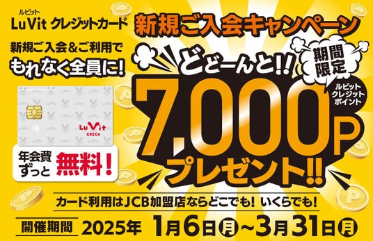 対象期間中の初回カードご利用で、もれなく7,000ルビットクレジットポイントを進呈。