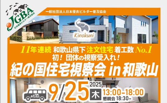 本年早くも5回目となる視察会は11年連続和歌山県下注文住宅着工数 No.1、紀の国住宅株式会社で決定しており、同社の展示場や体感ルーム等の施設を実際に視察する予定です。同社初の団体視察受入となる今回の視察会は2025年9月25日(木)に開催が決定しており、JGBA会員企業の方はもちろん、未会員企業の皆様もご参加いただけます。