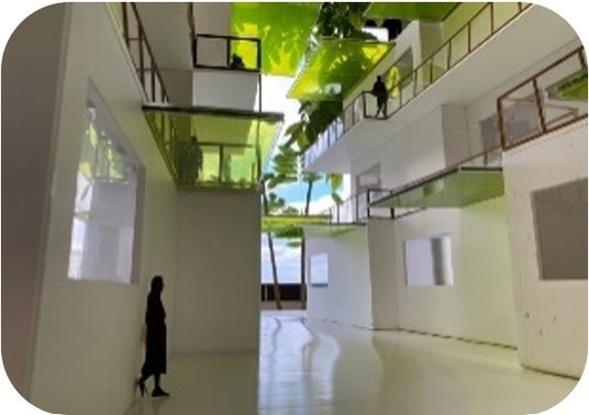 光合成パネルを屋根と庇に活用した集合住宅建築の模型