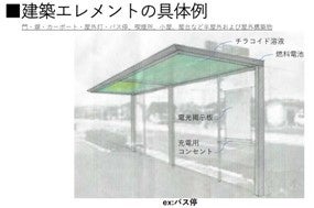 再生可能エネルギーに関する研究は多く行われていますが、光合成で水素イオンを発生させて電気エネルギーに変え、酸素を生み出し、緑色の美しい空間を作り出せる、という3点を同時に可能にしているものは他にありません。川上研究室と松尾研究室では、実際にびょうぶや窓に活用する光合成パネルを作成。屋根やひさしに光合成パネルを活用した、集合住宅やバス停などの建築デザインを考案しています。