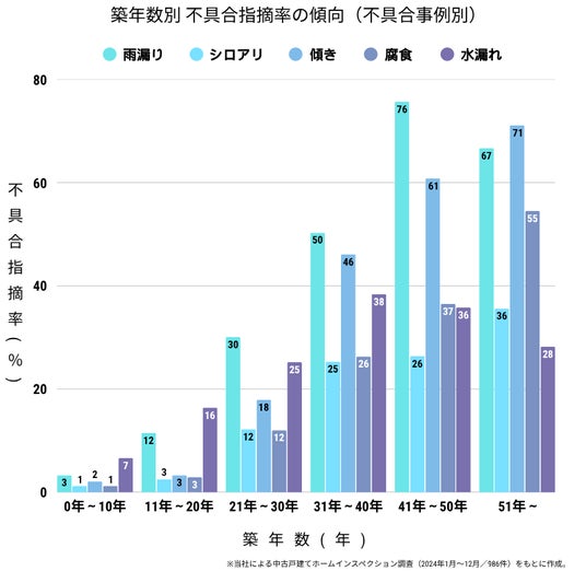 個人向け総合不動産コンサルティング・ホームインスペクション(住宅診断)、マンション管理組合向けコンサルティングを行う“不動産の達人株式会社さくら事務所”(東京都渋谷区/社長:大西倫加)は、2024年に実施した中古戸建てホームインスペクション986件の統計をもとに、「築年数別で見られる重要な不具合の傾向と対策」を分析。専門家の解説とともに、築年数では見抜けない中古住宅購入時の3つの重要視点を公表しました。本件に関する取材やご質問がございましたらお気軽にお問い合わせください。