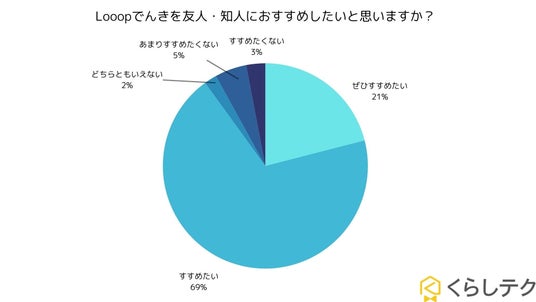 「Looopでんきを友人・知人におすすめしたいと思いますか?」という設問では、「ぜひすすめたい」が21.0%、「すすめたい」が69.0%となり、合わせて90.0%の利用者が肯定的な回答を示しました。