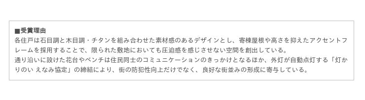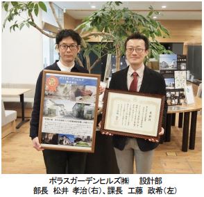 応募部門は、1.建築・まちなみ部門、2.啓発部門、3.緑化部門、4.清掃部門、5.その他 があり、 ポラスガーデンヒルズでは、建築・まちなみ部門で受賞しました。今回が、第 11 回、第 12 回に続き 3 度目 の受賞となります。