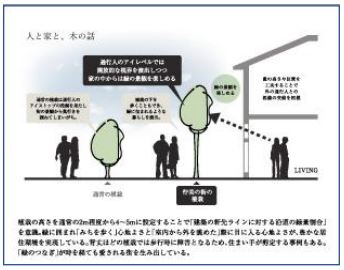 ●植栽計画はエクステリアデザイナーと共同で計画し ています。植栽の高さを通常の 2mから 4~5mに設 定することで、通行人のアイレベルでは開放的な視 界を演出しつつ、家の中からは緑の景観を楽しめる ようにしています。緑被率にも配慮しています。高木 は、シマトネリコやアオダモなどです。