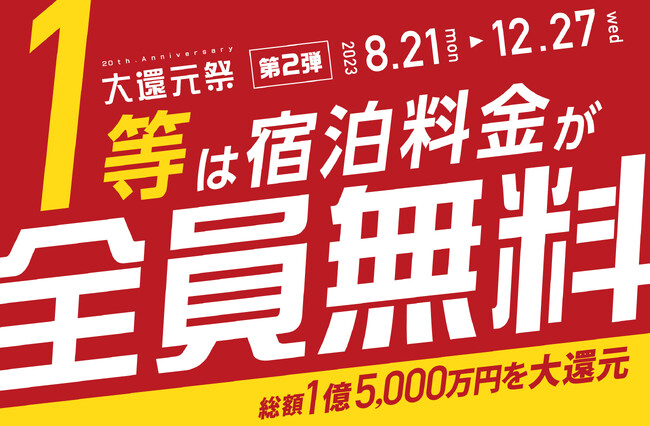 湯快リゾートは、石川県山代温泉に最初の温泉リゾートホテルを開業して、2023年9月に20周年を迎えます。20周年という節目において、ご愛顧いただいたお客様に感謝の気持ちを込めて「20周年大還元祭第2弾」をスタートいたします。ご好評いただいていた大還元祭第1弾よりさらにパワーアップし、ご参加いただいた方に総額1億5,000万円を還元するキャンペーンとなっております。チェックイン時に大還元くじにチャレンジいただき、1等はグループ全員の宿泊料金がなんと無料に!2等と3等もお得な特典をご用意しております。さらに、くじがハズレの場合も参加者全員に次回ご利用いただける500円割引チケットをプレゼント!