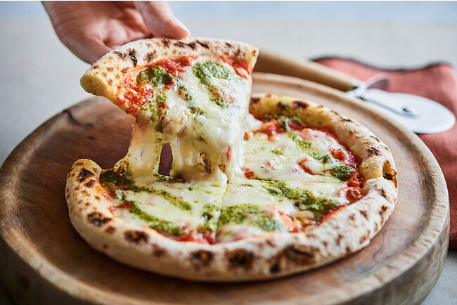 特長:自家製酵母を使用して発酵させたこだわりの生地に、イタリア産モッツァレラチーズとトマトソース、仕上げにバジルソースをトッピング。もちもち生地にジューシーなトマトソースが染み込み、チーズが溶け出す瞬間はたまりません。シンプルかつ絶妙な組み合わせで、何度でも食べたくなる味!