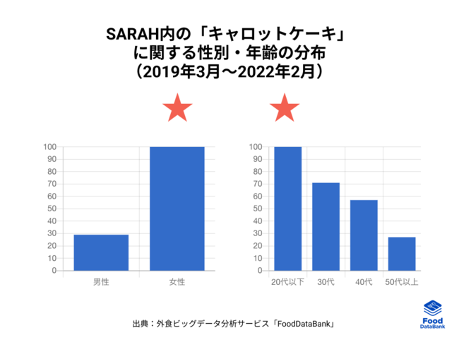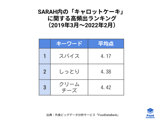 性別・年代別人気度を見てみると、20代女性から人気を得ていることが分かります。また、高頻出ランキングからはキャロットケーキの特徴でもある「スパイス」に対する評価が高いこと、「しっとり」した生地、「クリームチーズ」といった素材についても高評価であることが分かります。