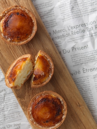 道産クリームチーズとカスタードを合わせ、クリームチーズダイスを加えたタルトをこんがり焼き上げ、さらに表面をバーナーでカリッと仕上げたチーズブリュレです。