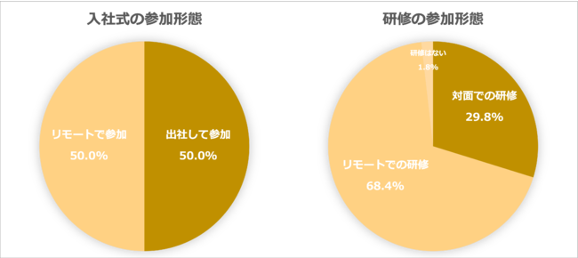 入社式の参加形態については、出社して参加の「対面式」が50.0%、リモートで参加の「リモート式」50.0%の回答結果になりました。また、研修の参加形態については、「リモート研修」が68.4%で、「対面研修」が29.8%になりました。入社式は対面とリモートが半数ずつで割れる一方、研修の参加はリモートが多数を占める結果になりました。