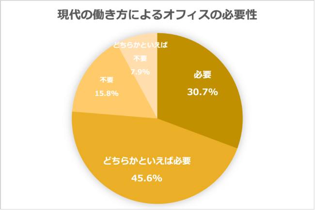 最後に現代の働き方においてオフィスの必要性を聞くと、「必要」30.7%と「どちらかといえば必要」45.6%を合算した76.3%が必要派の回答をする結果になりました。