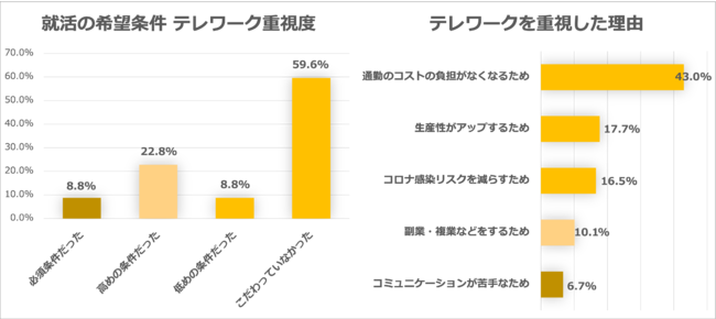 就活の企業選定でテレワークをどの程度重視していたかについては、「こだわっていなかった」59.6%と「低めの希望条件だった」8.8%を合算した68.4%が働き方としてテレワークを重視していなかった結果になり、重視派の回答は31.6%でした。「重視派」の回答理由として最も多かったのが、「通勤コストの負担がなくなるため」43.0%で、次いで「生産性がアップするため」17.7%、「コロナ感染のリスクを減らすため」16.5%の回答結果になりました。