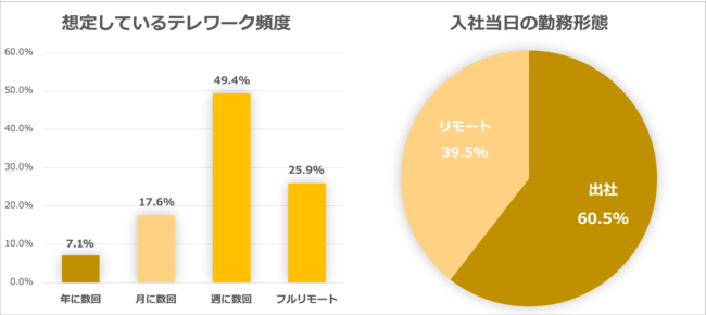 テレワーク率が8割に対して、入社日当日は「出社した」が60.5%と出社率が上回り、「リモートだった」は39.5%でした。