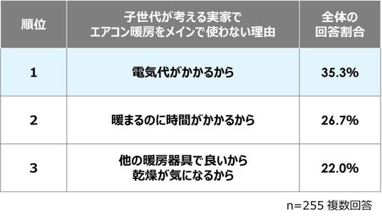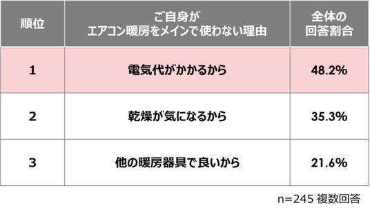 エアコンの使用を避ける理由として第1位は「電気代がかかるから」でした。また、第3位には「他の暖房器具で良いから」が挙げられています。