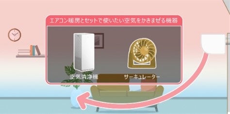 風向を下向きにしても、時間とともに温度ムラはできてしまいます。より温度ムラを抑えるには、空気清浄機やサーキュレーターなどの活用もおすすめです。エアコンと向かい合わせに置き、天井方向に風をおくります。室内の空気をかきまぜれば、さらに温度ムラがやわらぎます。気流をコントロールしながら、ムダな電力消費を抑えましょう。