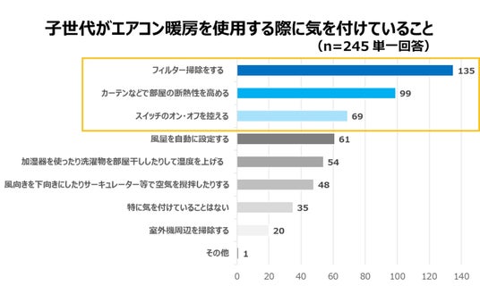 また、エアコンをメインに使っている子世代の多くは、フィルター掃除や部屋の断熱対策、スイッチのオン・オフを控えるなど、エアコンを効率的に使うための工夫を意識している人も多いようです。