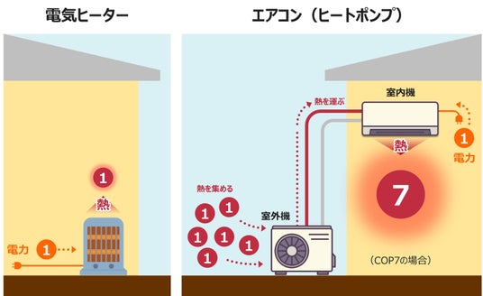 冬場に寒さを感じるのは空気中の「熱」が少ないからです。暖房器具は主に、室内の空気中にある「熱」を増やすことで室内を暖かくしています。一般的な電気ヒーターは電力をそのまま熱に変えるため、「1」の電力で「1」の熱をつくります。一方、ヒートポンプは、電力を使って屋外の空気中から熱を集める仕組みで「1」の電力で「3~7」の熱を生み出します。また、石油やガスを燃焼させる暖房器具と比べてCO2排出量が少ないことも特長です。エアコンは多くの電力を消費する機器ではありますが、様々な暖房器具と比べると、実は自宅の光熱費や地球への環境負荷を抑えられる優れた仕組みを持っています。冬の帰省時、こうした暖房の仕組みについて話すことも親孝行につながる有意義なコミュニケーションになるかもしれません。
