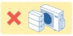 空気中の熱を集める室外機にとって、空気の通り道は大切です。室外機周辺の障害物で吸込口や吹出口がふさがれてしまうと、熱を効率的に集めることができず、無駄な電力消費につながります。障害物がない場合も、冬は室外機の周りに雪が積もって吸込口や吹出口をふさいでしまうこともあります。室外機の周辺はすっきりと余計なものは置かず、障害物は取り除くようにしましょう