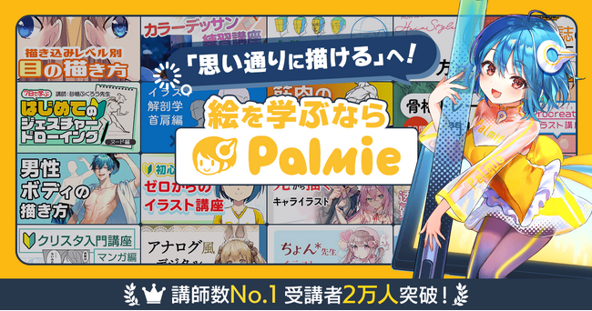 パルミーは、自宅に居ながらイラストやマンガの描き方が学べるオンライン教室です。著名クリエイターや漫画家、アニメーター、専門学校講師など、多くの「プロ」が講師を務めています。月額定額制(サブスク)で授業が受けられる「月謝制」は、累計利用者数20,000名を突破し、順調に利用者数を増やしています。
