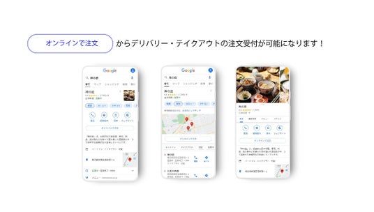 お客様が Google 検索および Google マップの[オンライン注文]ボタンをクリックすることで、店舗様の注文ページにリダイレクトされ、簡単かつ迅速にデリバリー・テイクアウト注文を実行できます。