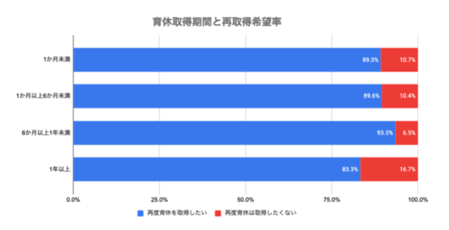 再取得希望率を育休取得期間別に見ると、「1か月未満」と「1か月以上6か月未満」の差は少なく、更に「1年以上」と回答した家庭の再取得希望率が最も低いことを踏まえると、育休取得期間が再取得希望率に与える影響は少ないと見てよいでしょう。
