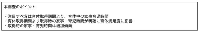 育休取得率を伸ばすためには、取得しやすい環境を整えることや、取得期間を伸ばせる施策以外にも、男性が育休取得期間中の家事育児時間を増やすための夫婦感のコミュニケーション、事前のノウハウ提供などが大切なことがわかります。