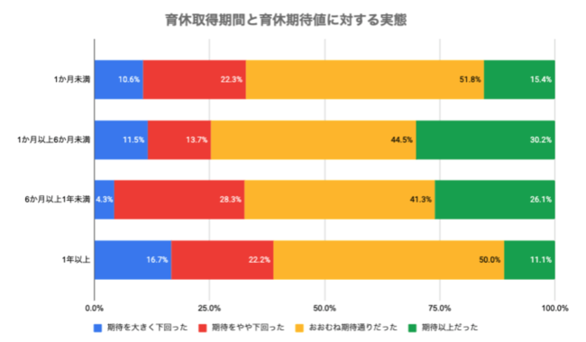 育休取得前の期待値と、育休中の実態を育休取得期間別に比較すると、必ずしも育休期間が長いほど期待に対する実態がよいわけではないことが判明しています。「期待以上だった」と回答した家庭に注目すると、取得期間が1か月未満だった家庭では15.4%、1年以上取得した家庭は11.1%と、取得期間が短い方が期待に応えられる場合もあることがわかります。また、1年以上取得した家庭は「期待を下回った」と回答した割合が最も高いなど、育休取得期間が長いほど期待値に合った育休になるとは言えないようです。