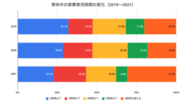 2019年から2021年にコネヒトが実施した調査のデータを比較すると、育休中の男性の家事育児時間は年々増加傾向にあることがわかりました。育休取得時の家族の期待に沿うことができ、再度取得したいと感じられるような満足度の高い男性育休を進めていく上で、よい傾向にあると捉えることができます。
